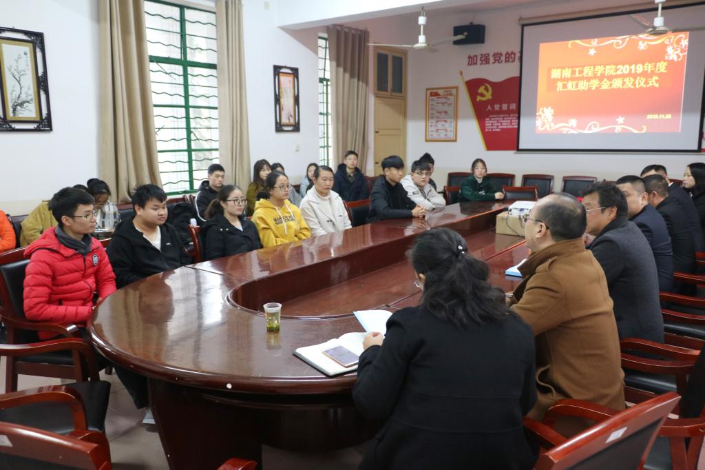 11月26日下午,太阳集团tyc33455cc在4教306举行2019年度汇虹助学金颁发仪式。湖南汇虹试剂有限公司总经理陈国夫、副总经理方华伦、总经理助理朱思昊、人力资源部部长匡平平,公司党委书记李艳红、副书记陈镇、应用化学教研室肖鑫教授及受助员工代表参加。仪式由肖鑫主持。