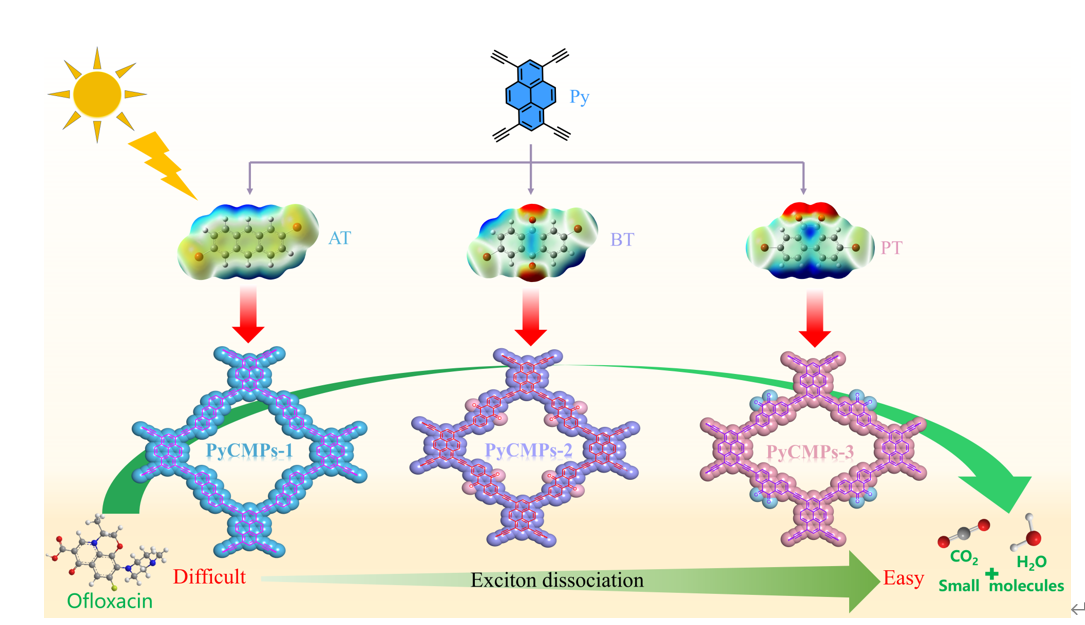针对水环境中的抗生素和有毒金属等共存污染物对生态环境和人类健康造成双重污染问题,该团队基于应用半导体光催化技术,通过直接C-H芳基化策略构建了一系列共轭微孔聚合物(CMPs),该光催化剂不仅表现出显著的激子解离和分子间电荷转移,而且以显著的效率产生高通量的O2•−,实现了氧氟沙星高效氧化和铀(VI)高效还原。这项工作实现了CMPs同时去除水体环境中的有机污染物,将有助于开发基于CMPs的光催化系统来有效处理复杂的废水污染体系。研究成果以“Engineering Exciton Dissociation and IntermolecularCharge Transfer to Boost Superoxide Radical in Conjugated Microporous Polymers for Simultaneous Elimination of Coexisting Contaminants”为题在国际著名期刊《Chemical Engineering Journal》(中科院工程技术一区top期刊,IF:13.3)发表。公司为第一完成单位、第一通讯单位,太阳集团tyc33455cc张伟杰博士为论文第一作者,阳海教授为通讯作者。