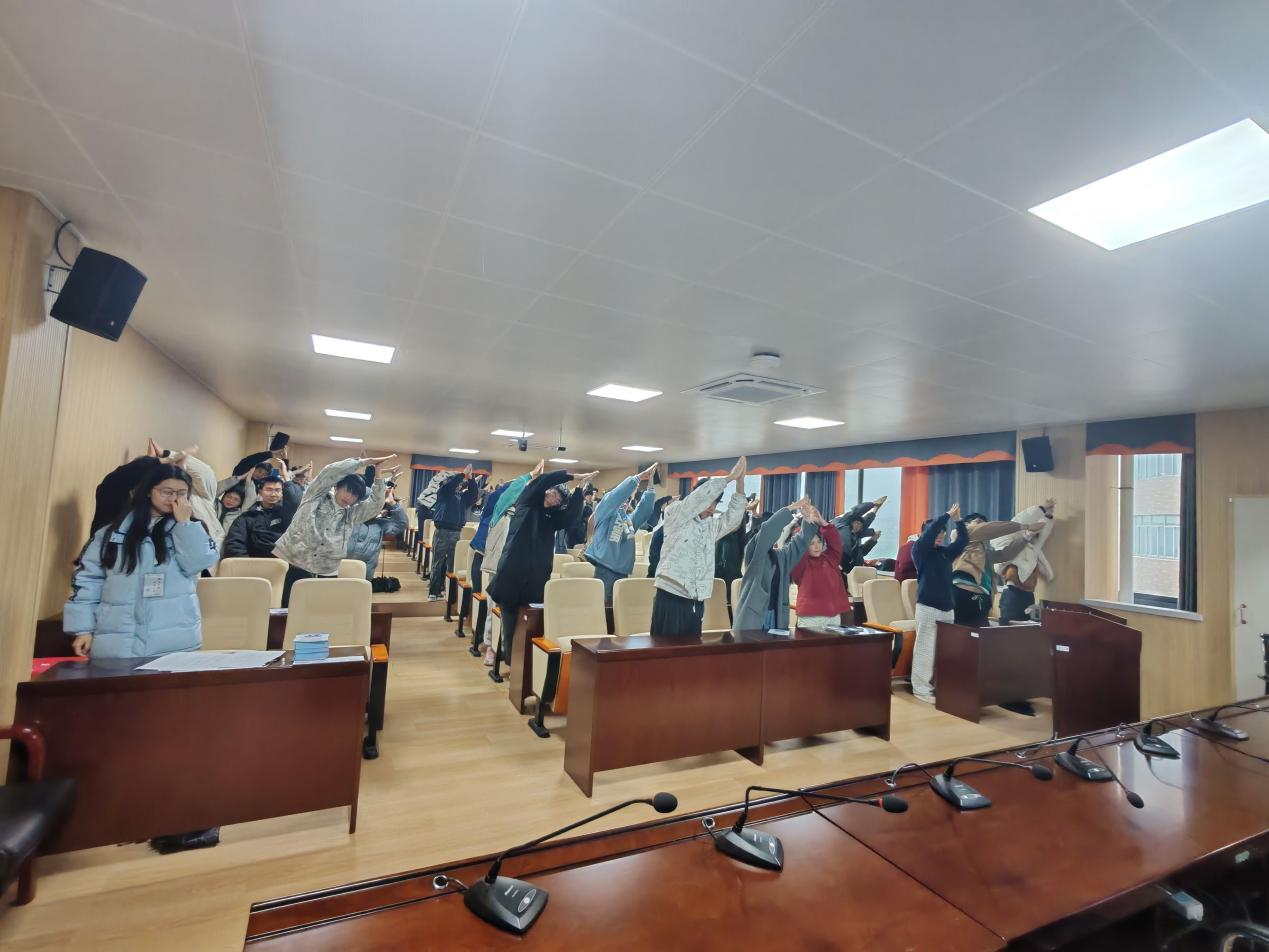 会上,黄玉娟老师分别从四个方面开展培训:一是总结回顾上学期心理健康教育工作成效,并对本学期工作进行了系统安排;二是阐述心理危机的含义与特征;三是介绍心理危机的识别技巧和五级心理危机干预机制,并进行模拟实践;四是介绍心理调试技巧,在黄老师的带领下,全体同学沉浸式体验"心理健康歌手势舞",现场互动热烈,实现了寓教于乐的培训效果。