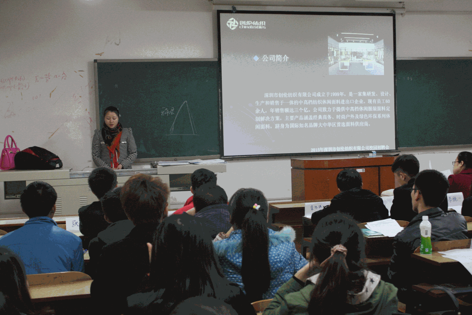 首先,张芝兰通过一段公司内部宣传视频向在座的应聘同学展示公司文化。其中,她从公司介绍、公司文化、产品简介、生产销售四个方面向在场同学介绍。她谈到公司拥有经验丰富的销售、生产和品控部门,在每一个环节都确保质量达标,执着追求客户体验。接下来,她结合公司产品与销售范围表示公司定位为国际知名服饰品牌首先面料供应商,有很高的市场占有率,设计与研发都有专属的团队,公司带领团队斩获许多专业荣誉证书。最后,招聘方进行专业测试,并于成绩合格的同学进行一对一面试,并于部分同学达成初步协议。