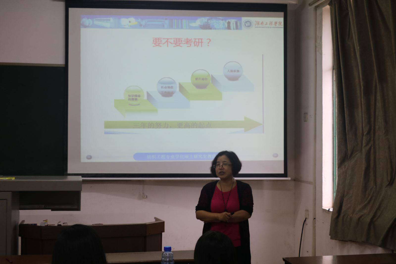 会议伊始,陈建芳副经理向大家简单介绍了2018年研究生考试的报考流程,并向同学分析了近几年的考研形势,同时提醒同学们在报考公司时要对自己有准确的定位,填报前需要预先了解报考院校,不要盲目跟风。随后,陈建芳副经理向大家介绍了化学化工公司的优秀员工,以此激励大家。紧接着,陈经理着重向同学们介绍了本院员工报考本校纺织工程方面的研究生招生的相关奖励政策,通过副经理的细致介绍,大家了解到纺织工程是本校历史最为悠久的专业,其地位在全国也排名前列,同时本校纺织工程专依托于企业是为企业培养特需型人才,因此研究生毕业以后就业十分方便。并且,陈建芳副经理还特别提出,公司也有意招聘在本院就读的优秀研究生留任老师,学办易苏老师便是公司研究生毕业后留任老师。最后,易苏老师上台以自身经历来鼓励同学们积极报考研究生。