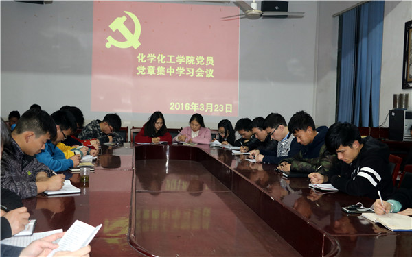 3月23日晚7点,化学化工公司员工党员在四教306召开了党章集中学习会议暨民主评议会。化学化工公司党支书记胡爱钦、副书记张建国出席会议。员工一支部书记李芳郴、二支部书记易苏、三支部书记刘思博老师以及化学化工公司全体在校员工党员参加会议。本次会议由李芳郴主持。