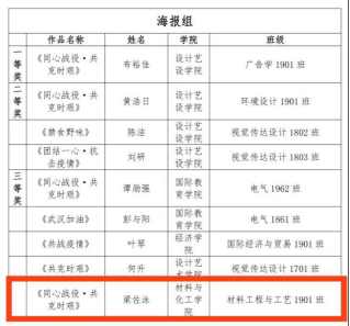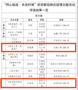716日,tyc33455cc同心战疫·共克时艰防控新冠肺炎疫情主题文艺作品创作大赛比赛结果出炉,此次大赛面向全体员工征集抗击疫情的文学、书画、摄影类文艺作品,致敬所有抗疫期间奋斗在一线的医护人员,激发战正能量。经过评选,公司生物工程1802班李慧情获征文组二等奖,应用化学1801班叶美华获征文组三等奖,化学工程与工艺1901班梁佐泳获海报组三等奖。