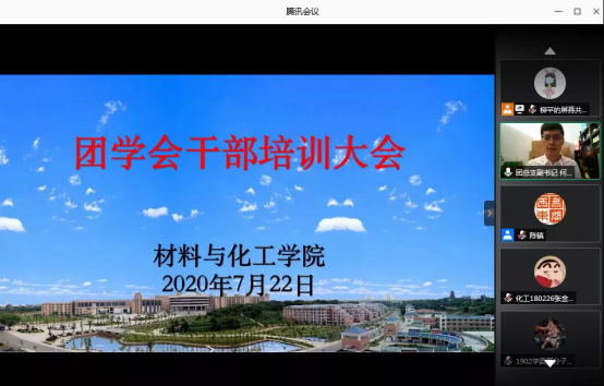 722日,公司举行团学会干部培训大会,公司党委书记李艳红、副书记陈镇、全体辅导员及老一届员工干部代表、新一届团学会干部在线参会。会上,易苏主任宣读团学会主席团及主要干部名单,原团总支副书记生物1701班赵卓和新一届员工干部代表现任团总支副书记应用化学1801班何清海发言。随后,陈镇和李艳红分别讲话,并对员工干部提出具体希望和要求。