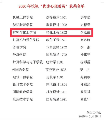 本月,在2020年心理健康教育特色活动项目评选中,公司申报的《“疫”过天晴--致敬疫情中可爱的人们》项目获立项。在2020年公司“优秀心理委员”评选工作中,公司轻化工程1803班心理委员李泓丽获奖。