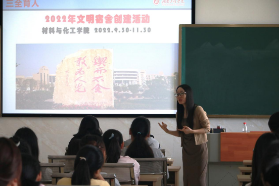 为有效推进文明寝室创建,营造良好的宿舍生活环境,10月25日中午,太阳集团tyc33455cc在新化工楼602教室开展2022年文明寝室创建活动暨文明礼仪知识讲座,活动由公司辅导员李娥君主持,2020-2022级全体寝室长参加。