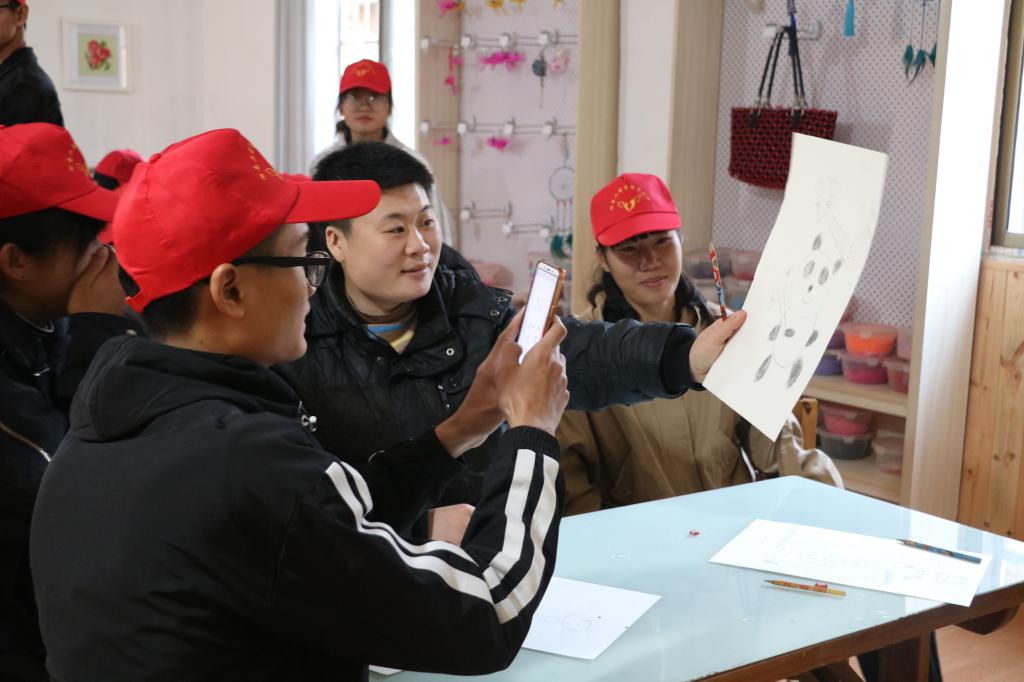 走进托养中心,一位女生便从教室跑出来,热情地向一位志愿者说:“这位小姐姐好漂亮!”此时,走廊上每位志愿者脸上都露出了笑容,原本紧张忐忑的心得到了放松。本以为托养中心的同学会害羞胆怯,可他们却用欢快的语言、轻松跳跃的步伐改变了大家的想法。来到教室后,志愿者与托养中心的同学们一起画画,认真的神情,在每一位托养中心的同学与爱心社社员的脸上展现着。当作品完成时,托养中心的同学拿给身旁的志愿者看,十分骄傲地说着:“看,这是我画的!画得好不好?”大家纷纷竖起大拇指为他点赞。