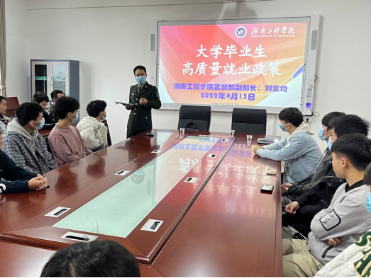 为鼓励应届毕业生积极参军入伍,做好2022年tyc33455cc大学毕业生应征入伍工作,4月15日下午,太阳集团tyc33455cc邀请公司人民武装部副部长刘宸均在化工楼A304会议室为公司2022届毕业生进行征兵入伍政策宣讲。会议由公司党委副书记陈镇主持,公司党委书记张何、征兵专干陶庆忠及意向入伍毕业生等参会。