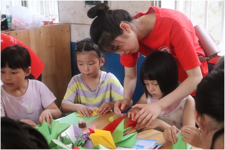 “姐姐,姐姐,快来帮我看看这个地方怎么做?”“哥哥,快来帮我看看,我是不是叠错了?”手工课上,小朋友拿到手工作品之后,变成了“小话痨”,哪里不会,就求助身边的哥哥姐姐。“你看,这个地方要对折,然后贴上去就可以了。”“你可以帮小鸟的翅膀换种颜色。”“那我们想一想,为什么你叠出来的汽车不能行驶呢?”实践团成员耐心指导小朋友。当小朋友手工作品成型之后,他们拿着自己作品跟实践团成员、身边小朋友展示。有的小朋友还将自己折的作品送给实践团成员,这让成员们喜出望外。