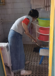上午,志愿者们带着真挚的祝福和卫生工具,走进了唐教师的家中。已退休的唐老师见到志愿者们的到来十分开心。他热情招呼大家坐下来,与同学们聊起了退休前工作的点点滴滴。接着,志愿者们开始了卫生清扫志愿服务活动,他们分工合作,陆续清洗了唐老师家中的空调滤芯,擦拭了空调外壳,打扫了卫生间、洗手台、地板、窗户玻璃等。几个小时后,唐老师家中窗明几净。