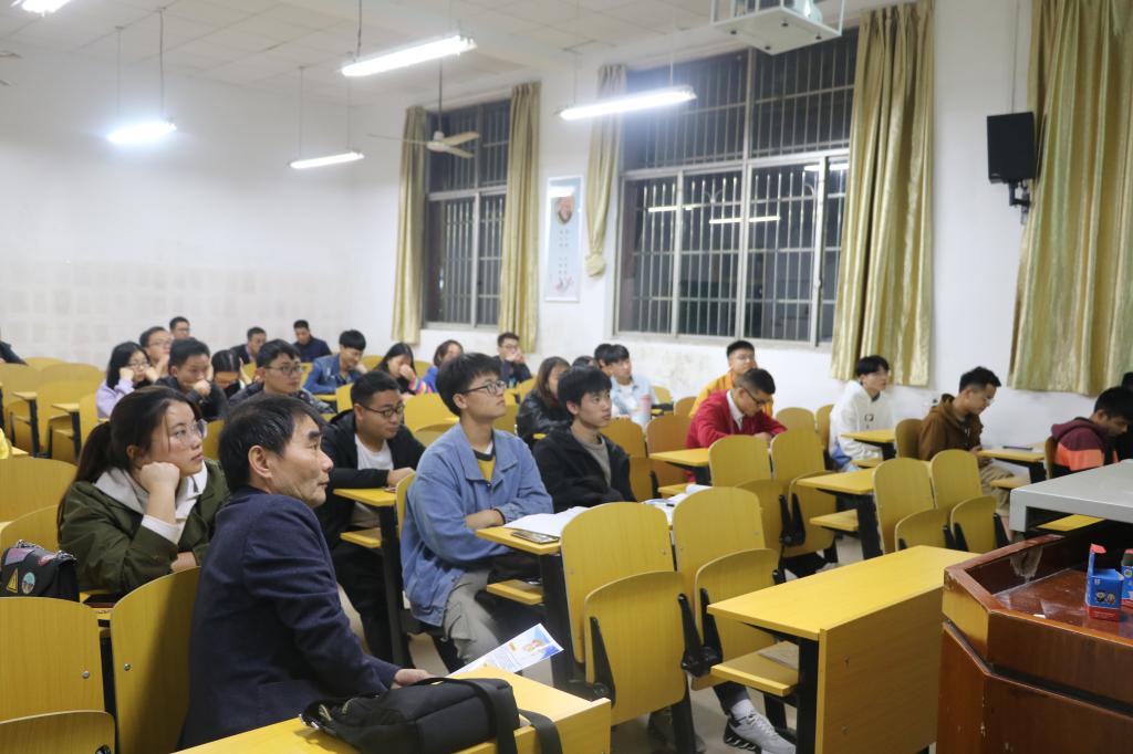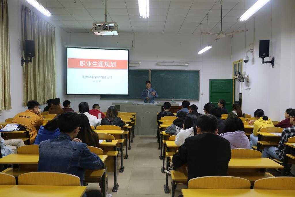 2019年11月15日晚,太阳集团tyc33455cc邀请公司优秀员工英德极丰染织有限公司主管朱志明在红楼102举行了一场创新创业经验分享会,轻化工程专业老师及员工20余人参加。