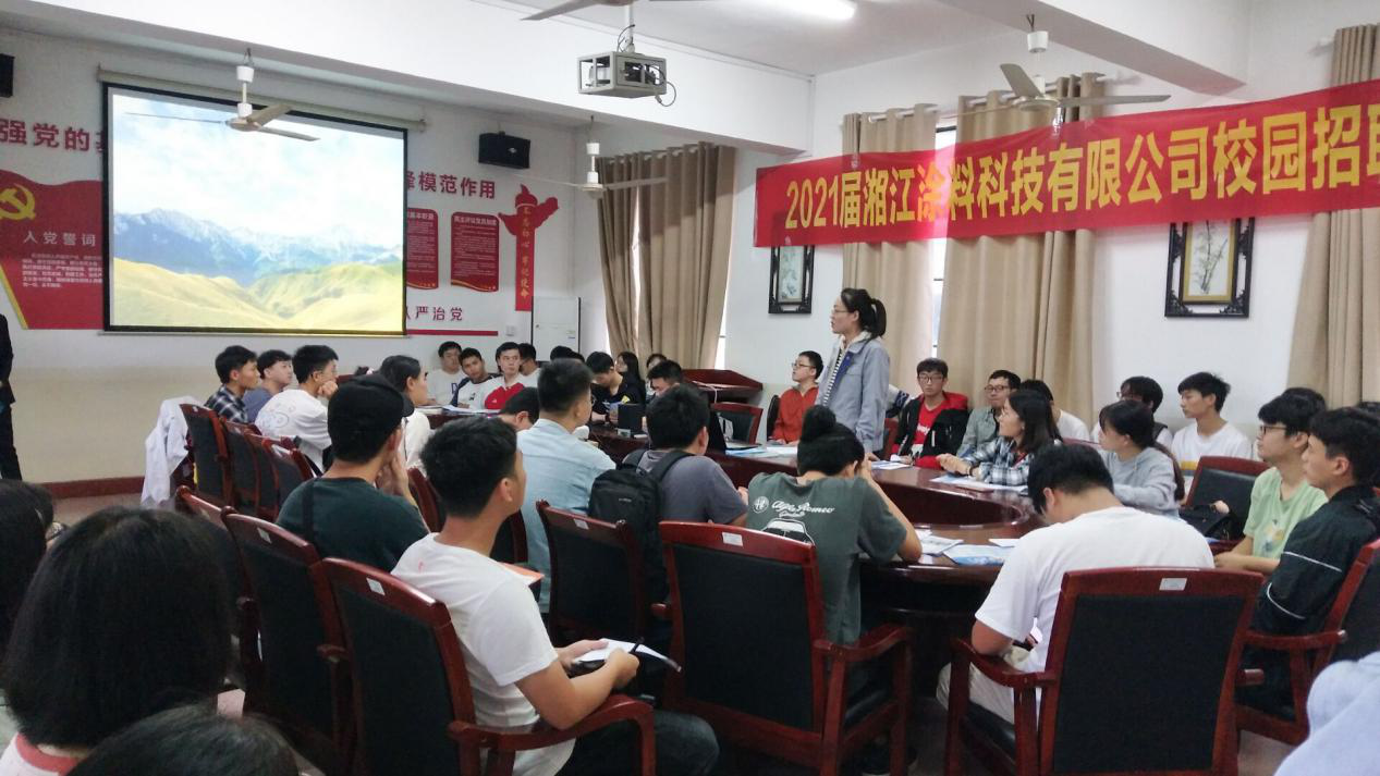 招聘会开始,成迎首先播放了该公司的宣传视频,让同学们对公司有了初步的了解。随后,成迎上台做简单的自我介绍,并以PPT的形式对公司进行深入介绍。成迎主要从公司简历、产品构成、企业文化、员工发展,员工福利等几个方面来介绍公司。湘江涂料科技有限公司是由湖南湘江涂料集团全额投资筹建。注册资本20000万元,公司占地224.48亩,总投资83000万元,公司已于2016年6月正式建成投产,项目完全建成后,将成为湖南省规模最大,实力最强的涂料生产和基地和研发基地。该公司核心业务为水性工业涂料、建筑涂料、工程装备涂料、汽车涂料。随后,来自应用化学2016届的员工蒋卓轩向同学们介绍了在该公司工作的感受,分享了一些工作经验,鼓励同学们积极参与招聘。该公司所打造的专业战略、人才战略、全球战略、合作战略吸引着同学们,同时对应届生的优越条件和丰厚的福利也引起了在场许多同学的兴趣。会后,该公司人员与参会同学进行了面对面的回答,解决了在场员工的问题,许多同学投递简历,并参与了面试。