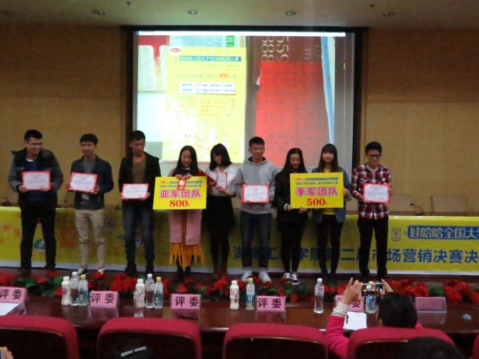2016年11月17日晚7点,由tyc33455cc化学化工公司和外国语公司联合主办的娃哈哈市场营销大赛决赛暨颁奖典礼在图书馆二报告厅举行。参与本次颁奖典礼的评委有化学化工公司学办主任吴菲、外国语公司团总支书记张婷、娃哈哈公司湘潭站负责人蒋海清以及化学化工公司与外国语公司的部分员工干部,本次比赛颁奖典礼由化学化工公司高分子1601班的李弼珺同学主持。