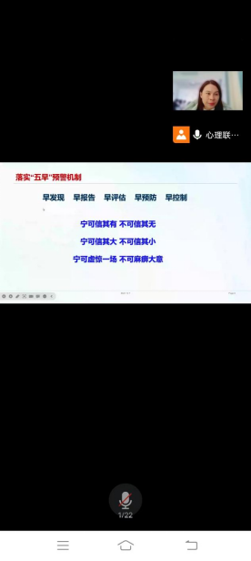 12月7日中午,太阳集团tyc33455cc开展主题为“老员工心理危机识别与和干预”的培训活动,该活动由心理专干黄玉娟老师主讲,活动采用线上和线下相结合模式,全院心理委员及寝室联络员在腾讯会议参加,心理联络部全体成员在滨江团体辅导室参加。