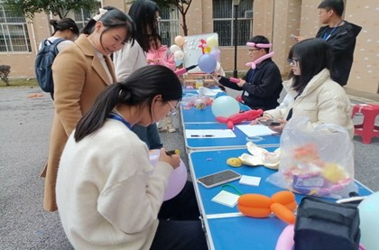 活动分为两个环节,第一个环节为“书信解忧”。参与者认真写下自己近期的困惑和心事,并投至“解忧”箱中,现场将愿意展示的纸条在现场展板上展出,由其他参与者写下自己的“排忧”建议,以此达到解忧的目的;同学们也可以在便签纸上写下了自己的美好祝愿,选择张贴或放入“树洞”箱中。第二个环节为创意气球。同学们根据自己的想法,将气球盘绕成不同的形状,有花朵、动物等,或者用彩笔在气球上面进行绘画。绘画中不小心弄破气球的“砰!砰!”声,为活动增添了一阵阵的欢声笑语。