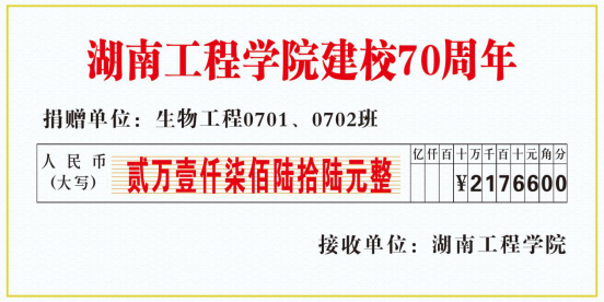 金秋十月,丹桂飘香,在母校迎来建校七十周年之际,生物工程0701、0702班员工向母校捐赠,为母校献上最真挚的祝福。