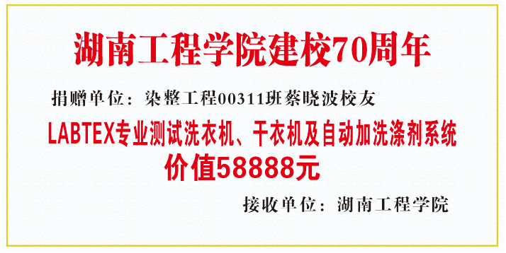 值此母校建校七十周年之际,怀着回报母校,助力母校发展的拳拳之心,蔡晓波向母校太阳集团tyc33455cc捐赠LABTEX (莱波特斯)美标AATCC M6纺织品专业测试洗衣机一台、LABTEX美标AATCC M6D专业测试干衣机一台、LABTEX自动加洗涤剂系统和测试耗材等,价值58888元。