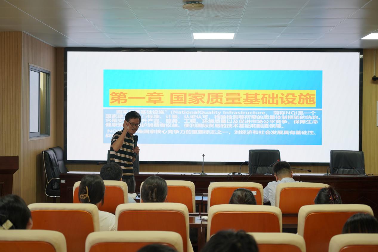 报告会上,文学锦围绕国家质量基础设施建设和当代老员工发展两大主题展开阐述。在国家质量基础设施建设方面,他立足行业发展现状,从计量标准与检测检验两个维度切入,深入解析质量基础设施建设的战略意义。围绕管理体系,他重点解读了新目标下的审核流程与实施要点,为师生构建了清晰的认知框架。