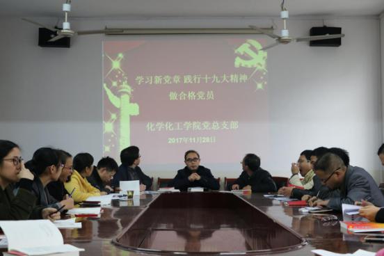 11月28日下午,化学化工公司党总支部在书记胡爱钦的带领下,组织全体教工党员认真学习了新党章,更好地学习贯彻党的十九大精神,进一步加强教工党员思想教育, 全面提升教工党员的党性,充分发挥党员的先锋模范作用。