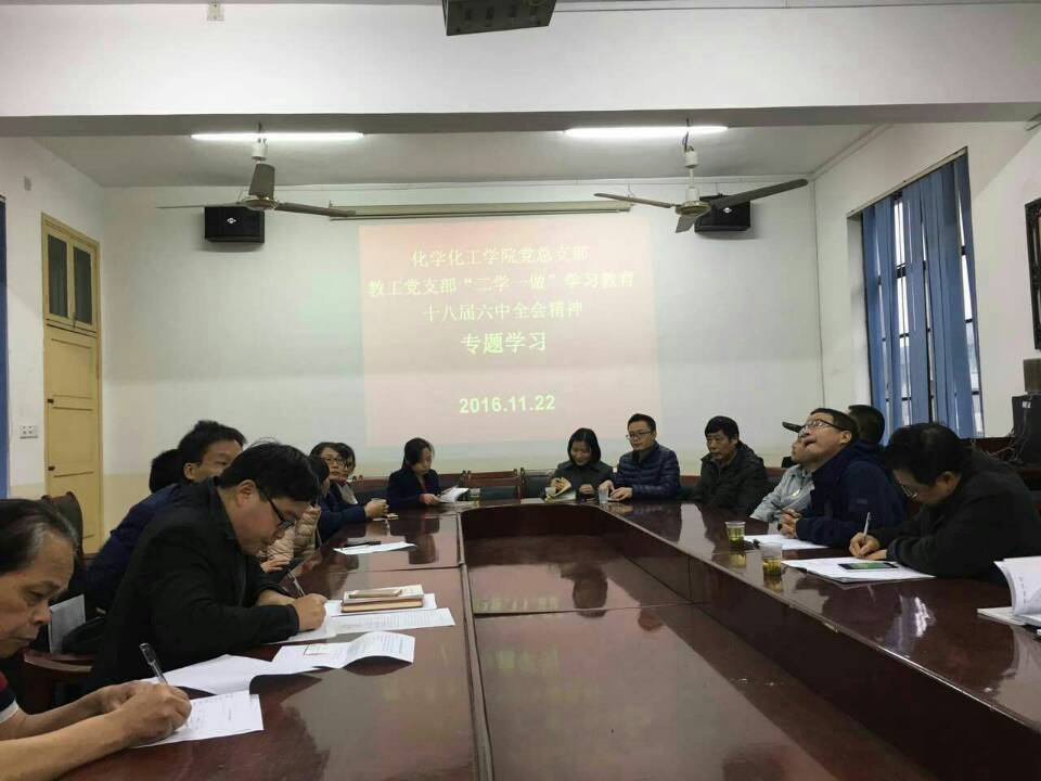 2016年11月22日,化学化工公司党总支召开全体教工党员大会,学习贯彻十八届六中全会精神。会议由公司党总支书记胡爱钦主持。