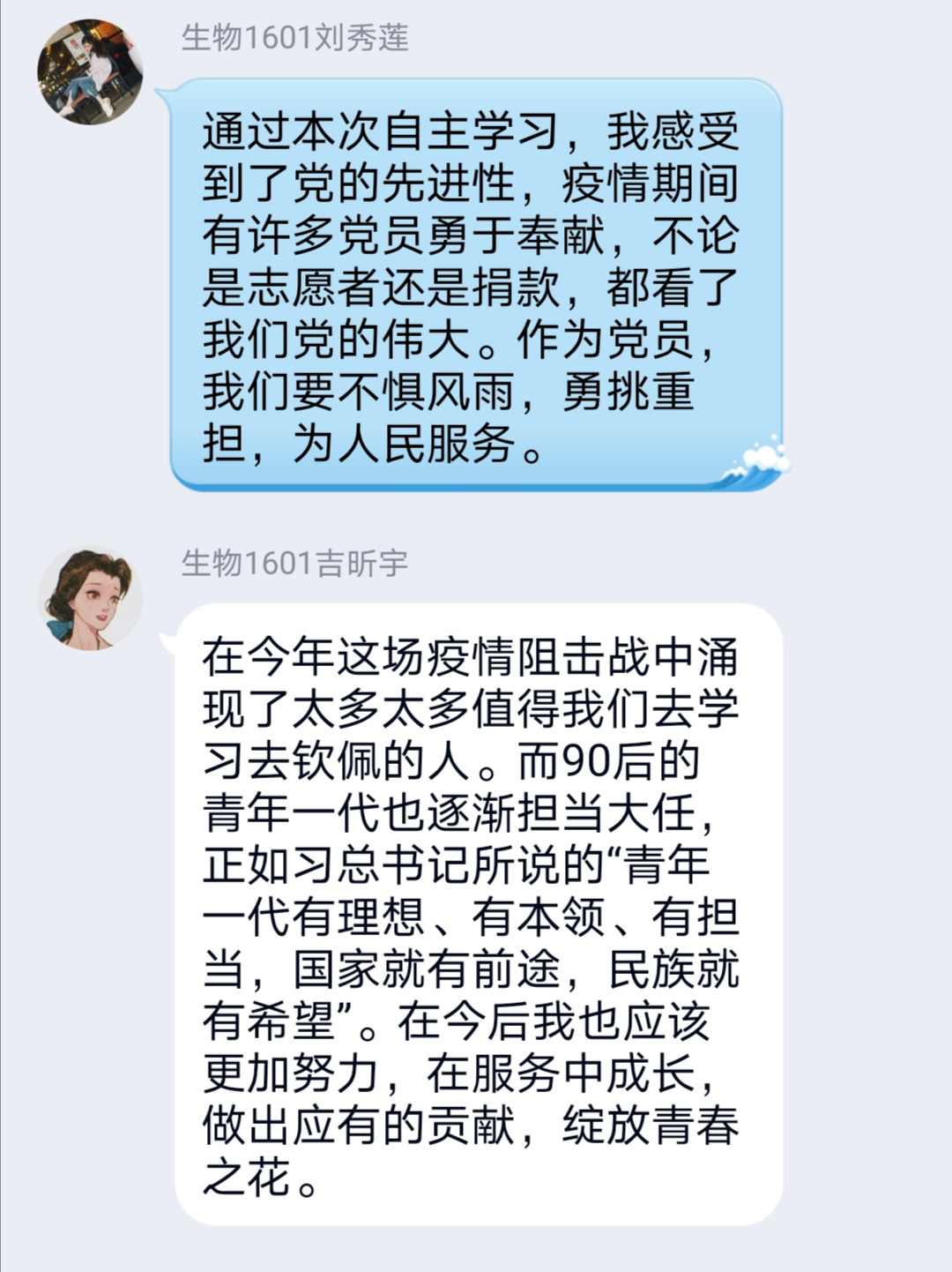“战疫无情人有情,最美不过逆行者。当面临疫情危难时期,简简单单的一句“我来”,却是多么铿锵有力、振奋人心,而我们也要坚守初心牢记使命,向这些英雄学习。”党员唐珊表示。“在疫情过程中,患难见真情,共同抗疫情,无数90后与党员冲锋在战疫一线。而我们作为青年一代应当有理想、有本领、有担当,国家就有前途,民族就有希望。在未来的日子,做好新时代青年,学习新思想,练就过硬本领,将来在党和人民需要的地方发光发热。”发展对象刘敏说。