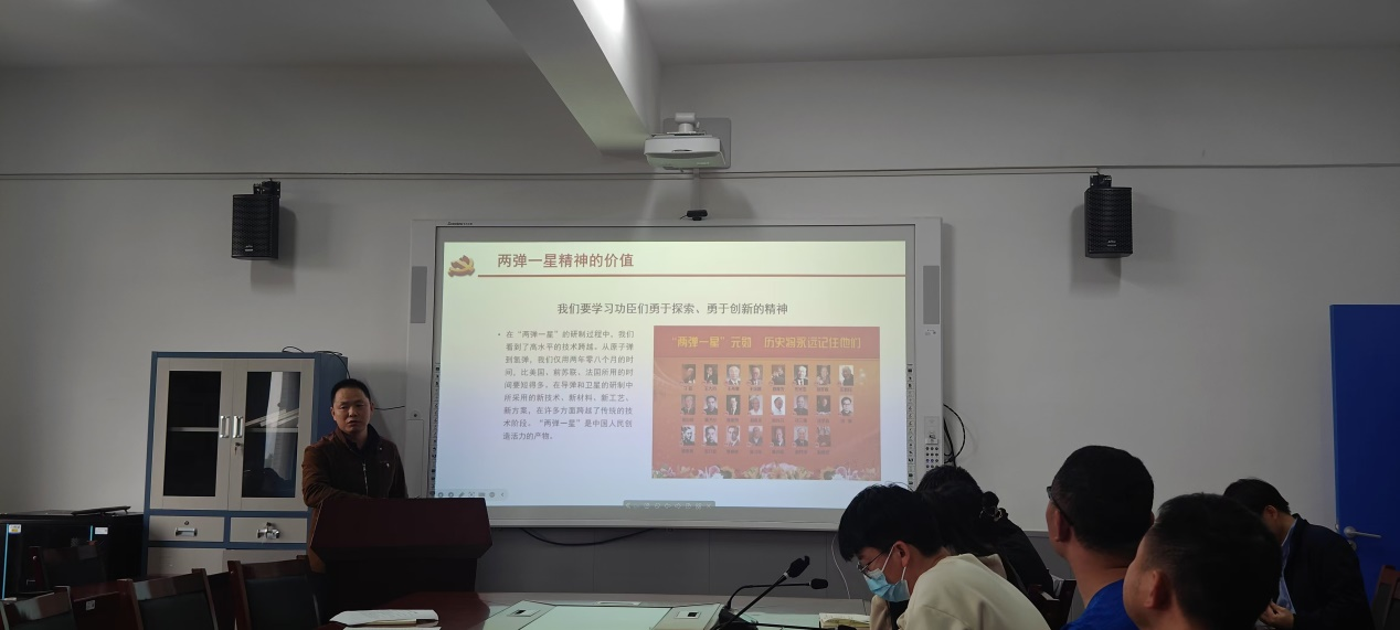 支部党员蒋开军同志通过阐述新中国成立75周年以来的辉煌成就,上了一堂题为“两弹一星精神”的党课。他从两弹一星精神的形成、两弹一星精神的内涵、两弹一星精神的价值为大家讲了一堂生动的党课。党员同志听了之后,热血澎湃,深刻感受到新中国成立以来的辉煌变化。