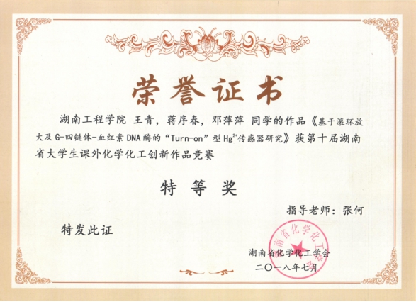 主持国家自然科学基金项目1项、湖南省自然科学基金项目3项、湖南省教育厅优秀青年项目1项,湖南省教育厅重点项目1项,参与“973”、“863”、“国家自然科学基金重大项目”、省自然科学基金、省发改委“创新引领”示范建设项目等10余项;申请国家发明专利18项,授权10项;发表论文50余篇,在Biosensors and bioelectronics、Sensors & Actuators B: Chemical、Microchimica Acta、Analytica Chimica Acta、分析化学等SCI期刊收录论文近30余篇,主编专著1部,参编教材1部,先后获得“湖南省化学化工学会青年化学化工奖”、tyc33455cc科技工作先进个人、“湖南省化学化工学会第十三届优秀论文一等奖”、“湖南省第十五届自然科学优秀学术论文二等奖”、“2011-2013年度和2015-2017年度湘潭市自然科学优秀学术论文一等奖”等奖项。